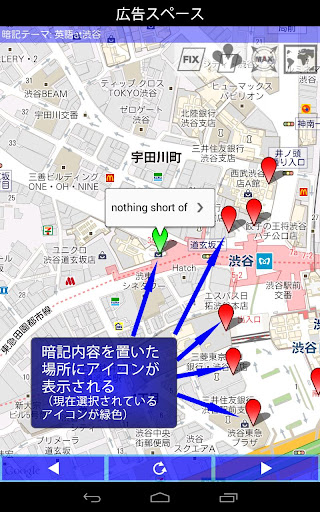 トップ画面の「復習」の吹き出しを押して、復習したい暗記テーマを選択すると、復習用の地図が出てきます。暗記内容が結びつけられた場所には、赤や緑のアイコンが表示されています。地図画面の下に並んでいる「◀」「▶」ボタンを使ったり、指を使ってアイコンを選択することで、そこに結びついた暗記内容を「吹き出し表示」出来ます。