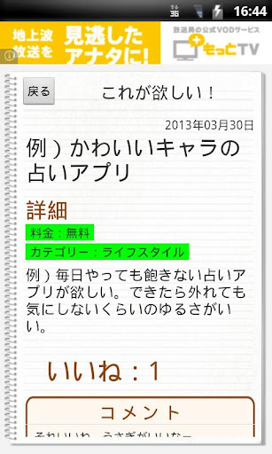例)かわいいキャラクターが毎日運勢を教えてくれる占いアプリが欲しい。あとはずれても気にしないのがいです。