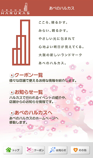 「あべのハルカス スマホアプリ」は、あべのハルカスにご来館いただいたお客様に対し、クーポン、お知らせ、店舗紹介などの、お得な情報を配信し、あべのハルカスをより楽しんでいただくことを目的としたサービスです。