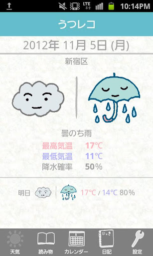 天気画面を見ると、今日の天気を教えてくれます。現在は、天気とカレンダーの機能が独立していますが、うつレコ開発チームでは、将来的には統合して、天気と気分の関係などを分析できるようにしていきたいと考えております。