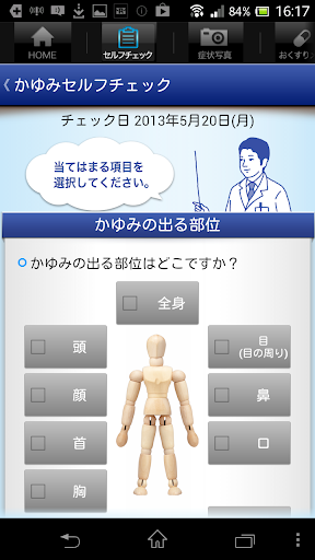 かゆみの程度を設問に合わせてチェックすると、お医者さんに伝えるべきことが整理できる便利な機能!受診する前に、ぜひチェックしておきましょう。