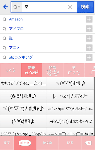 「新着」「特殊」「笑」などの顔文字カテゴリから好きな顔文字を選ぶだけ!