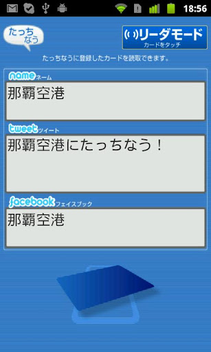 たっちなうはタッチでtwitterにツイートするサービスです。NFC携帯で利用できます。RFタグをいろんなところに貼って、タッチでツイート!Facebookのチェックインと連動もできます。