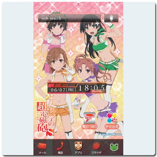 美琴や"アイテム"などの女の子キャラクターの壁紙を4点搭載しています。壁紙/アイコン/メニュー画面/ドロワー画面/時計ウィジェットなど、一括でとある科学の超電磁砲Sのデザインにきせかえできます!