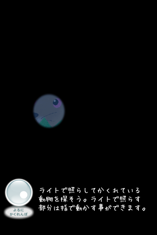 背景だけでなく、動物をかくす前景と一体となった絵をサーチライトで照らします。サーチライトはドラッグすると動き、ピンチする(2本の指で拡げる)と、大き-