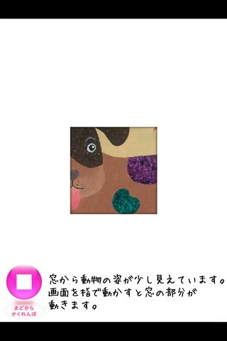 背景と一体となった動物の絵が、窓から一部だけ見えています。窓の位置は画面を開くたびに変わります。画面をドラッグすると、窓から見える絵が動きます。画面-