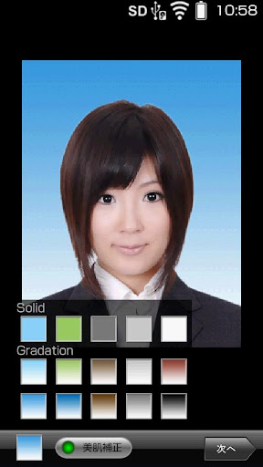 背景色は15種類用意しました。自動で顔以外を綺麗なグラデーションにします。顔を明るくきれいに見せる美肌機能も搭載しています。