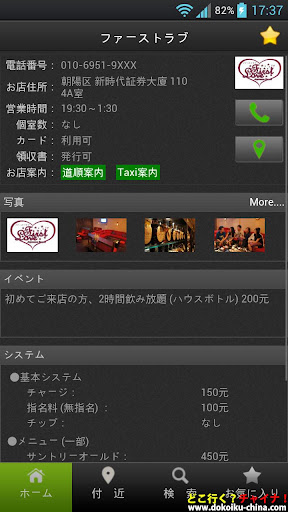 「どこ行く? チャイナ!」は、北京のバー・スナック・クラブの検索情報ツールです。 食事のあとに「近くでちょっと飲みたいな」とか、出張前に「どんなところがあるか調べたいな」ということ、ありますよね? 現地の情報雑誌もありますが常に持ち歩いているわけではないですし、日本ではなかなか手に入りません。