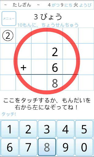 『はじめてのひっ算』は小学1年生、2年生ぐらいの子を対象に作成していますので、アプリ内の文字はなるべく読めるようにひらがなを使用しています。