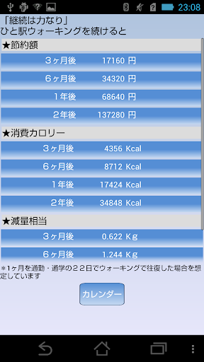 ・ひと駅ウォーキングの時間、消費カロリー、その脂肪量相当を表示してくれます。