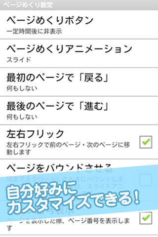 ページの初期表示の設定やページめくりの設定、タップや長押し等の設定も自由にカスタマイズできます。