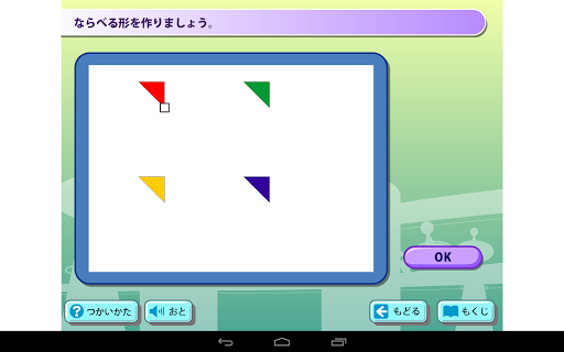 「暗算で計算しよう」「じゅんにすすむ」「長方形,正方形,直角三角形」「どんなもようができるかな」の学習ゲームを収録しています。