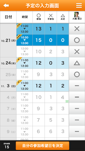 予定の招待に対する回答方法は、招待した人が提示する候補期間の中から自分が参加可能な日時を回答するタイプ(Aタイプ)と、候補日時に対して自分の都合を「◯(可能)」、「×(不可)」、「△(未定)」 で回答するタイプ(Bタイプ)があります。どちらのタイプもタップ操作のみで回答できる為とてもカンタンです。