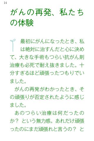 患者の方々に寄り添い、支えることの助けとなることを目指して、実際に再発がんを体験された方々とともに「信頼できる情報で、わかりやすく、役に立つもの」をまとめました。