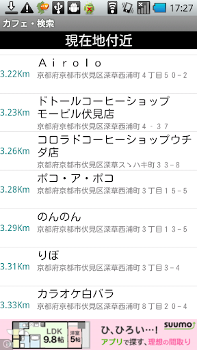 -「リスト」ボタンをクリックするとカフェ、喫茶店、コーヒー チェーン店のリストを距離順で表示します。
