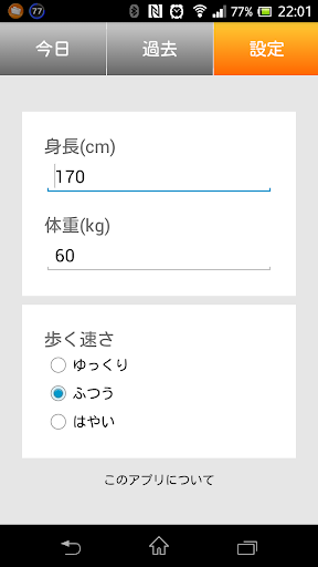 ・身長、体重、歩く速さの設定をすることで、より正しく消費カロリーを計算します