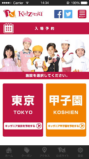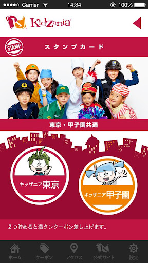 キッザニア公式アプリ限定スタンプカード、キッザニア東京、キッザニア甲子園のお得な情報などが確認できます。