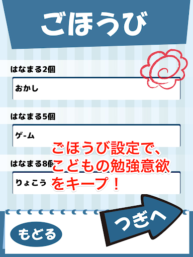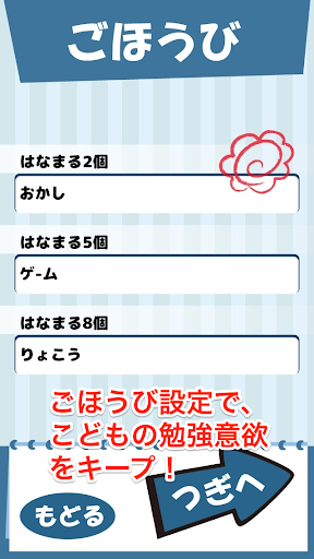 お子様の学習意欲を維持するための機能です。各単元をクリアする度に獲得できる「はなまる」の数に応じて、ごほうびを設定することができます。