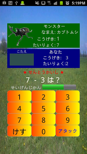「ひきざんマスター」は小学校入学前後のまだ数字に慣れていない時期に、ロールプレイングゲームのような雰囲気の中、楽しみながらいつのまにか引き算をマスターすることができる知育アプリです。