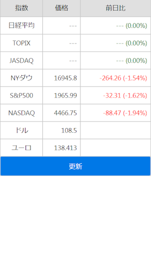 日経平均、TOPIX、JASDAQ、NYダウ、S&P500、NASDAQ、ドル、ユーロを一覧表示します。