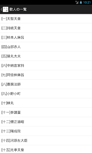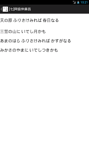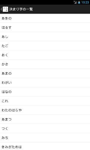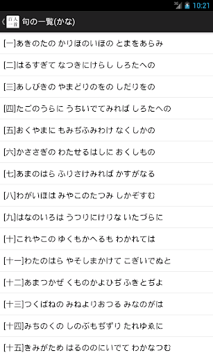 シンプルな百人一首のアプリです。句の一覧、かなの句の一覧、歌人の一覧、決まり字の一覧から、句を確認することができます。