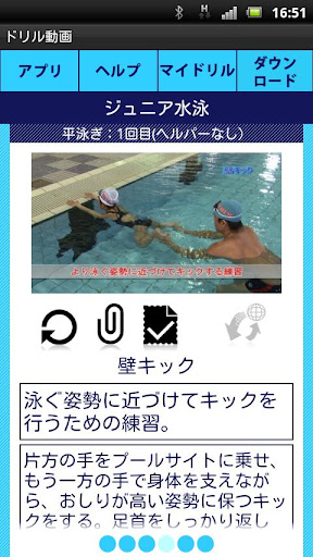 泳法ごとに25メートル泳げることを目標とした指導方法を紹介しています。映像に付随するレッスンメニューは「エンジョイスイミングポータル」のドリル動画の紹介から確認することができます。