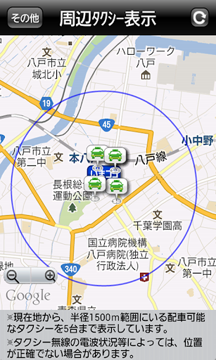 4.[その他] [周辺タクシー表示]機能を使って、現在地から半径1500m以内にいるタクシー位置を把握することができます。