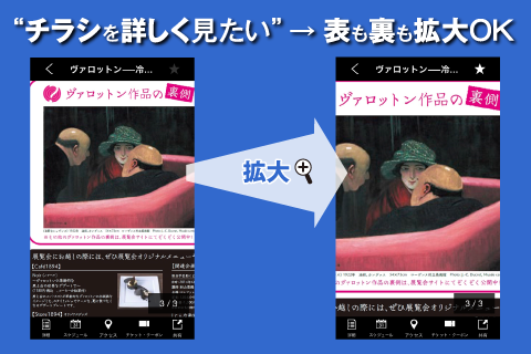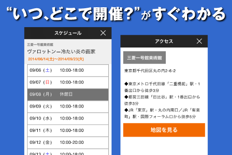 ・「詳細(料金や開催期間)」「スケジュール(開館時間)」「アクセス情報」「チケット/クーポン」などの情報も確認