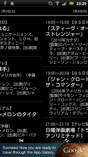 テレビ番組表から映画を検索して表示するアプリです。テレビ番組表データから映画を抽出して、タブ形式で日付別に映画を表示します。地上波とBS放送から7日分の映画を確認できます。映画のリストをタップすると、映画の詳細情報を検索できます。