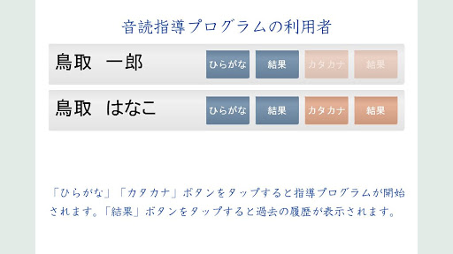 初めてお使いになる方は、鳥取大学ディスレクシア小枝研究室のホームページでユーザー登録をしていただき、ログイン後にメニューの「ディスレクシアの音読指導プログラム」から指導を行うお子さんを登録してこのプログラムにアクセスしてください。