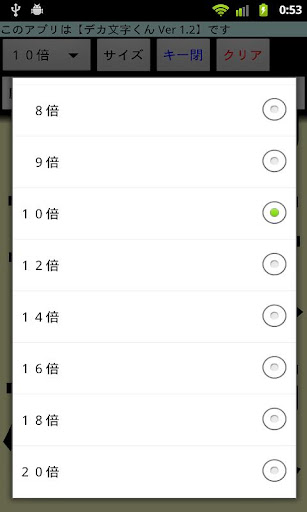 文字の拡大サイズは「ボタン群」の左端ボタンで選択できます。標準(1倍)~20倍まで、15段階で任意に選択可能です。
