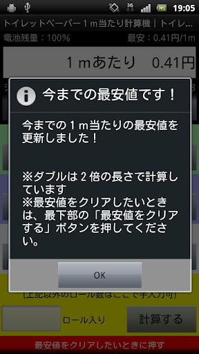 トイレットペーパーの1m当たりの価格を簡単に計算できるアプリです。