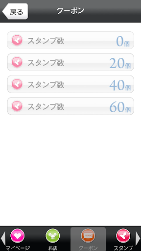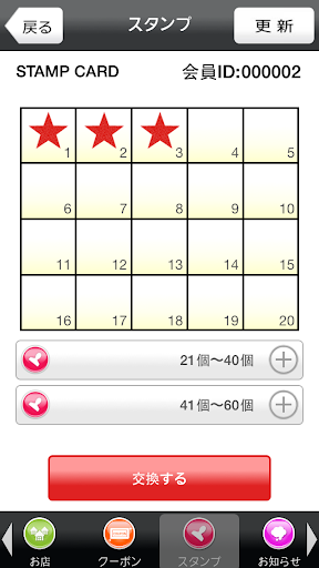 ■アプリを毎日起動したり、シェアしてどんどん貯まるスタンプ。スタンプを集めるとアプリユーザー限定クーポンと交換できる。