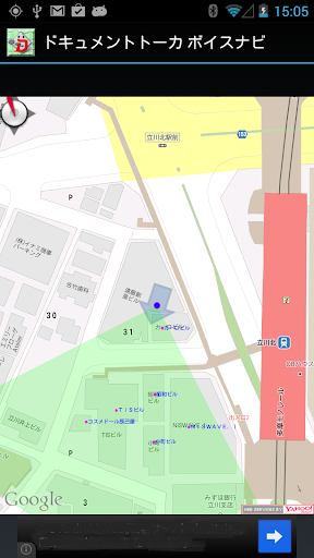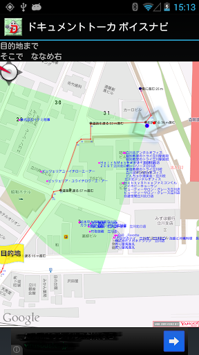 この扇形の範囲が端末の向きによってぐるぐると変わります。施設案内では、この扇形の範囲に入っている施設を近い順に読み上げています。