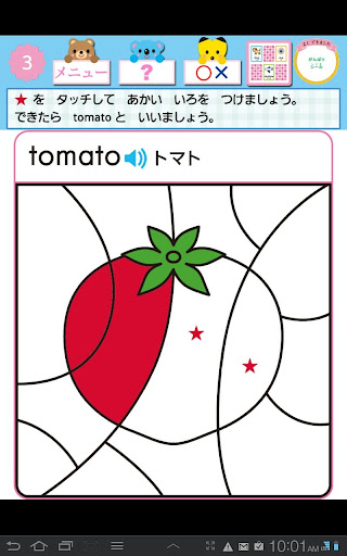 迷路、塗り絵、カード遊びなど、いろいろな手法をつかって、22の英単語を勉強します。バラエティに富んだ46問の問題で、動物、食べ物、顔、色、数など幅広い分野の英語力を養います。問題への解答方法は、直感的な操作で楽しい!