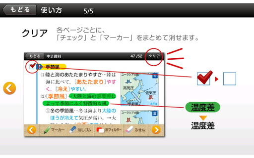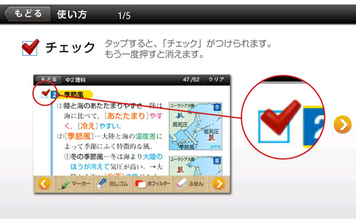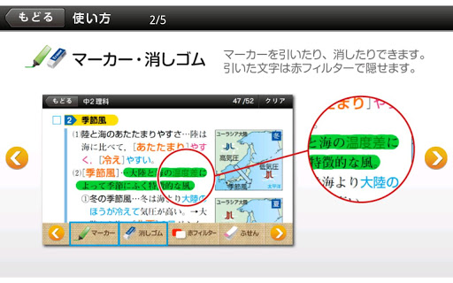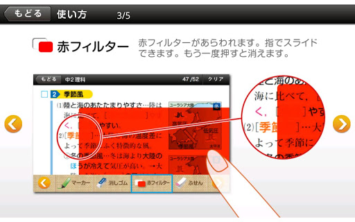 「赤フィルター」機能を使えば、指でスライドできる赤フィルターがあらわれ、答えを隠したり、ずらして答えを確認できたり…と、慣れ親しんだ感覚で暗記学習ができます。さらに、自分で暗記したい重要部分には、緑色の「暗記マーカー」で線を引いておくと、「赤フィルター」を通したときに文字が消えて、記憶できているか簡単にチェックが可能!一度引いたマーカーも、「消しゴム」機能で消すことができ、繰り返し使えるのも、アプリならではの便利機能。