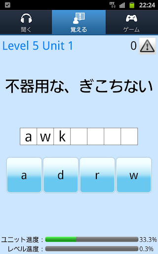 英単語のスペルを推測したり、文字を並べ替えて英単語を完成させたり、ヒアリングした英単語を入力したりと、様々なバリエーションで、覚えた英単語をゲーム感覚で腕試しできます。