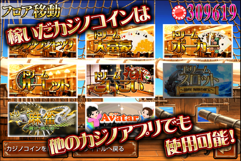 ドリームスロットはその他のGゲーカジノシリーズ(ブラックジャック、ポーカー、ルーレット、大富豪、花札)と連携されてます。稼いだコインは、Gゲーカジノシリーズの全ゲームで利用でき、共通コインでランキングを競ったり、スペシャルアバターと交換したり、楽しみ方は盛りだくさん。