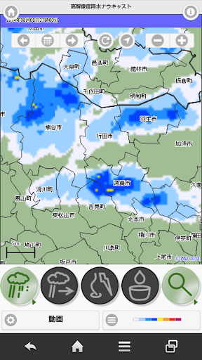 降水量を5分刻みで予測。「動画」ボタンを押すと、降水量の移り変わりをアニメーションで見ることができます。