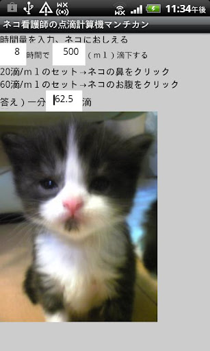 点滴の滴下速度を可愛いネコ看護師マンチカンが計算してくれるアプリです。