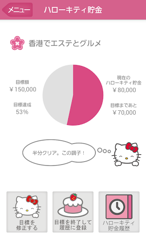 記録した収支内容に応じて、ハローキティからアドバイスがもらえたり、ハローキティ貯金では、あなたが設定した目標を達成するまで、ハローキティが応援してくれるので、楽しみながら家計管理ができます。
