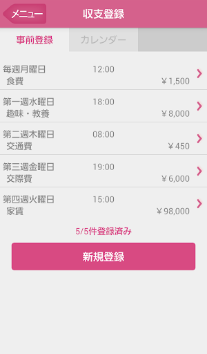 家賃やクレジットカードのお引き落としなど、繰り返しで発生する項目は、事前に繰り返し登録が可能なので記録を忘れてしまう心配もありません。