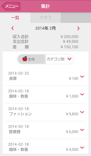 収支内容を一覧表やグラフでチェックできます。