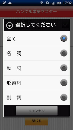 ・メニューキーから「設定」を選択すると、出題品詞を「全て」「名詞」「動詞」「形容詞」「副詞」の何れかに設定できます。