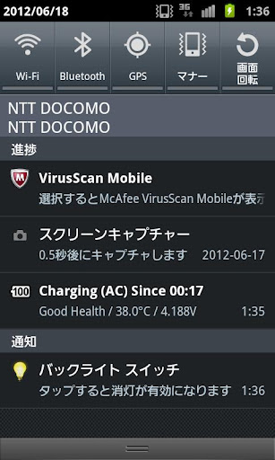 ステータスバーの通知領域(ノーティフィケーション)から、タップして切り替えることもできますので、ブラウザなど別のアプリケーションを利用している際に、画面を閉じることなくバックライト消灯(画面のスリープ)のオン/オフを切り替えることができます。