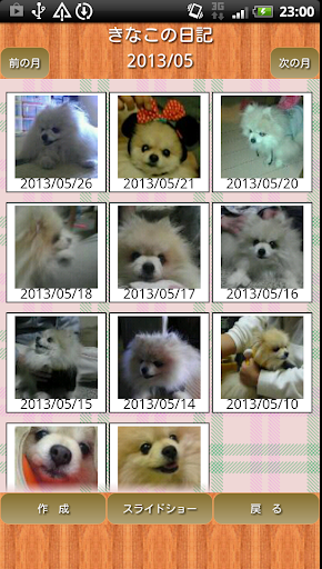 日記に使用している写真を自動的に切り替えて表示することができます。(日記一覧画面の「スライドショー」ボタンから起動することができます)