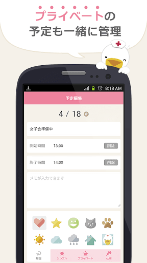 まるで手帳のように、看護師の予定もプライベートの予定も入れることができます。30種類のスタンプから、あなたのムードに合わせて選んでくださいね。シフトと予定をひとつの画面で同時に管理することで、看護師の日々の予定を立てるのが楽チンに!