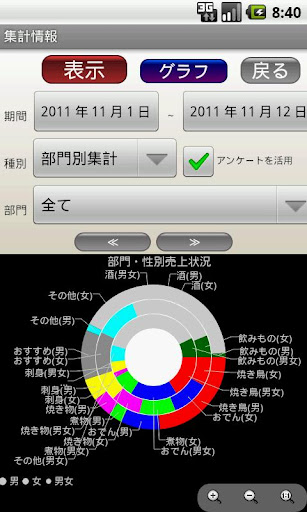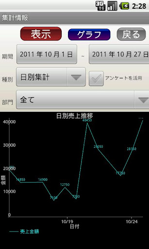 4. 集計情報では部門・日別・月別・曜日別・テーブル別の集計、および推移グラフ・円グラフが表示できます。