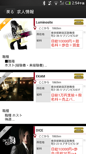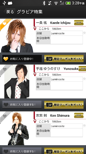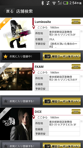 お気に入り登録をしているホストクラブ・ホストの情報が今いる場所から順に表示されます。
