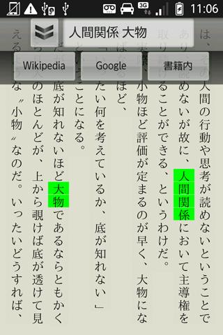 ・検索機能:書籍内本文から、Wikipedia、Google、書籍内への検索ができます。検索文字は複数選択可能です。